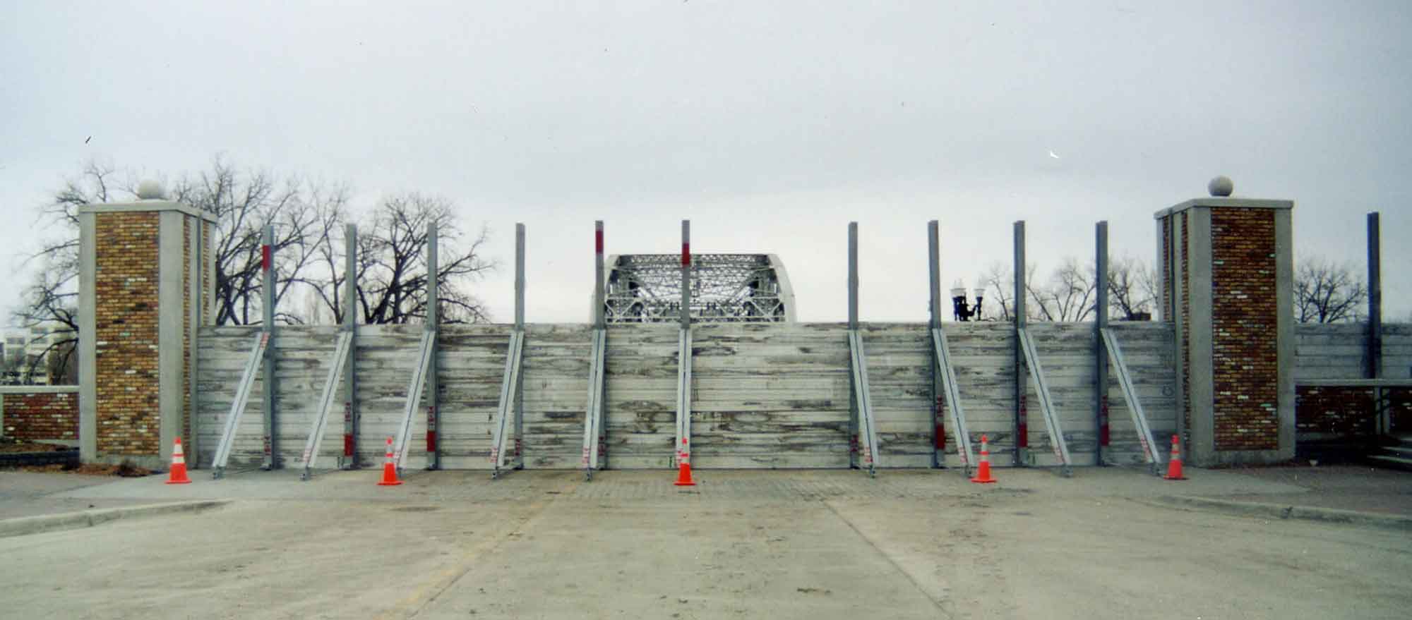 - Flood Wall Closures: For short-span openings in levees or flood walls (roadways, pedestrian entrances, utility crossings) the removable planks deploy only when needed to close the gap and complete the defense line.